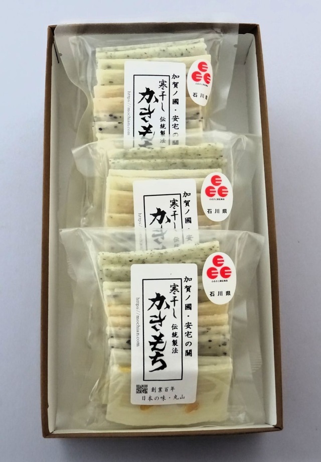 5種類(大豆・青のり・胡麻・昆布・えび):無添加。 全国菓子大博覧会・無鑑査賞。不使用:アルコール・砂糖・旨み調味料・着色料・保存料 石川県認定Eマーク商品。石川県産の糯米「神楽糯米」を100%使用した杵つき餅を、寒仕込み製法でゆっくりと干し挙げた・無添加品。加賀伝統の保存食です。昔は、厳冬に保存食として、おつまみ・おやつとして食べました。近年は、油であげたり・電子レンジでチンして食べます。焼きたてが食べられる手作りおかきとして人気です。 自然にやさしく、身体にもやさしい、「ハラもちがして消化がよい」と言われた元気になるおかきです。日本・石川のスローフードです。 こだわり・・・1,水は洗米・仕込から餅つき等全ての作業に、霊峰白山の雪どけ水の恵みをうけた伏流水を、更に電子処理によりイオン効果の高い、ミネラルの豊富な水を使用しております。 2,伝統の二度搗き製法でコシのある餅質。 3,大豆・青のり・胡麻・昆布・海老という5種類の山野海の自然材料で風味豊かでバランスが良い。 4,低温熟成乾燥にて、旨みを引き出すように仕上げております。 【召し上がり方】 今どきの薦め:電子レンジに3枚を間隔を広めにあけて並べて、500Wで約90秒レンジする。焦げ目は付かずに大きく広がり、サクサク香ばしく仕上がります。真っ直ぐ平らな仕上がりは難しですが早くて簡単で、硬くなくて食べやすい。ノンオイル仕上げで、小さなお子様から高齢者の方や軽い食感好みの方にお勧めです。そのままでも美味しいですが、お好みでバター・白だし・マヨネーズ明太子・胡椒・シナモンシュガー・はちみつなどでも美味しいです。 *ひと手間プラス・・・レンジしてから油(お薦めはオリーブオイル)で、通し揚げする。一度レンジで焼いているので、油を吸収せずヘルシーで&風味が一層高まり、香ばしくなります。そのままで美味しい。おやつ・おつまみに最高です。手づくりの焼きたての愛情込めた美味しいが楽しめます。会合などの差し入れや、パーティーなどでも喜ばれます。*更にスープに入れると、締め料理になります。 1,「焼く」: オ−ブント−スタ−(約1KWの場合)で約3〜5分で焼きあがります。ガス火・スト−ブでは、金網にのせて表裏繰り返しながら焼き上げます。 2,「揚げる」:油で低温(約160度)から生地を入れ、中火にて時間をかけて加熱し、シンが残らない様に揚げます。 3,小さく割って、フライパンなどで、油をひかないで、煎りやきにすると、サクサク香ばしい。其の儘食べてもよいが、お醤油や・マヨネーズ絡めてもおいしい。また、お茶漬け・お鍋・麺類に入れても美味しい。 *お好みにより塩・砂糖・黒砂糖・醤油・香辛料等にて味つけをして召し上がれます。