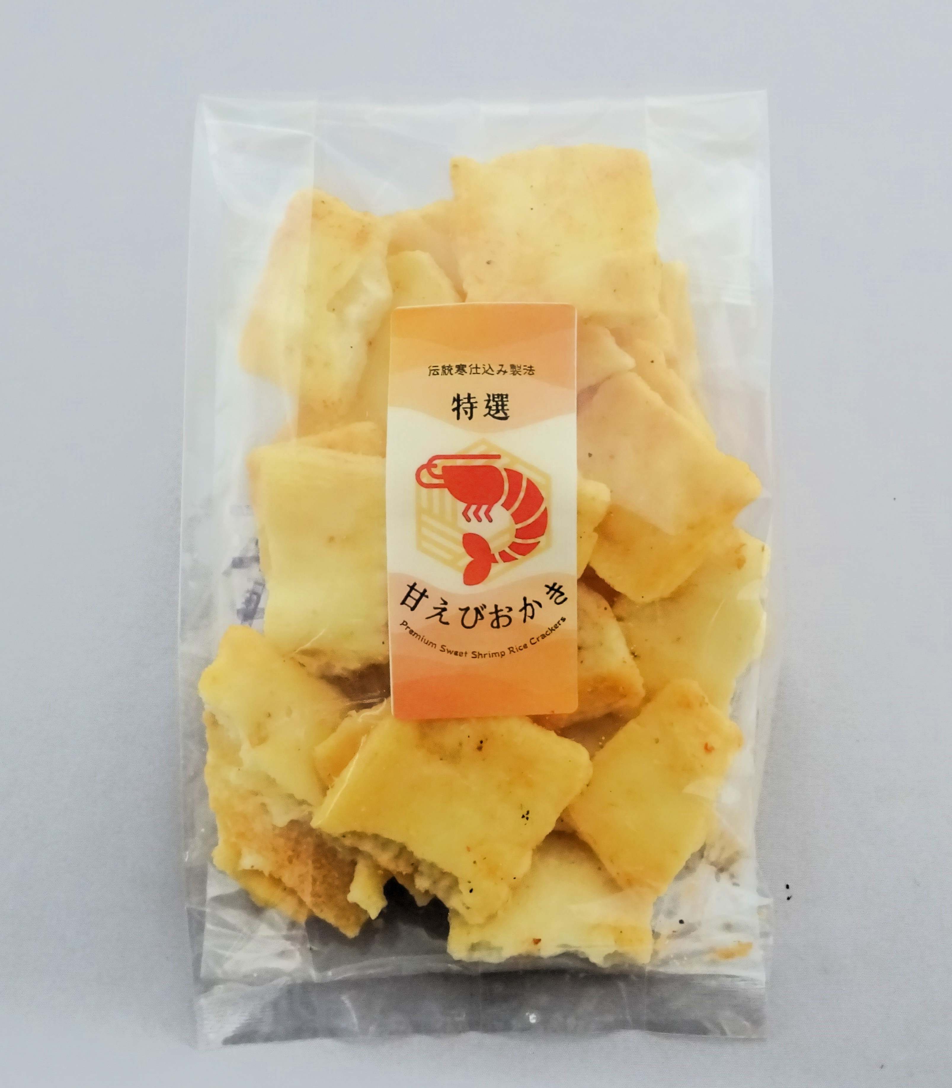 特選甘えびおかき割れ製品です。2ヵ月掛けて作る途中で破損した伝統製法ならではの産物で素。お買い得です。焼き塩と真珠の様な甘えびパウダーが特選餅の旨味を引き立てます。