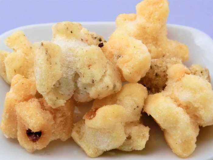 5種塩味:大豆・青のり・胡麻・えび・昆布の山海5種餅を6カ月低温熟成乾燥して、植物油にて2度揚げして、遠心分離機で脱油して、焼き塩を絡めた<手間暇かけた伝統の逸品>です。