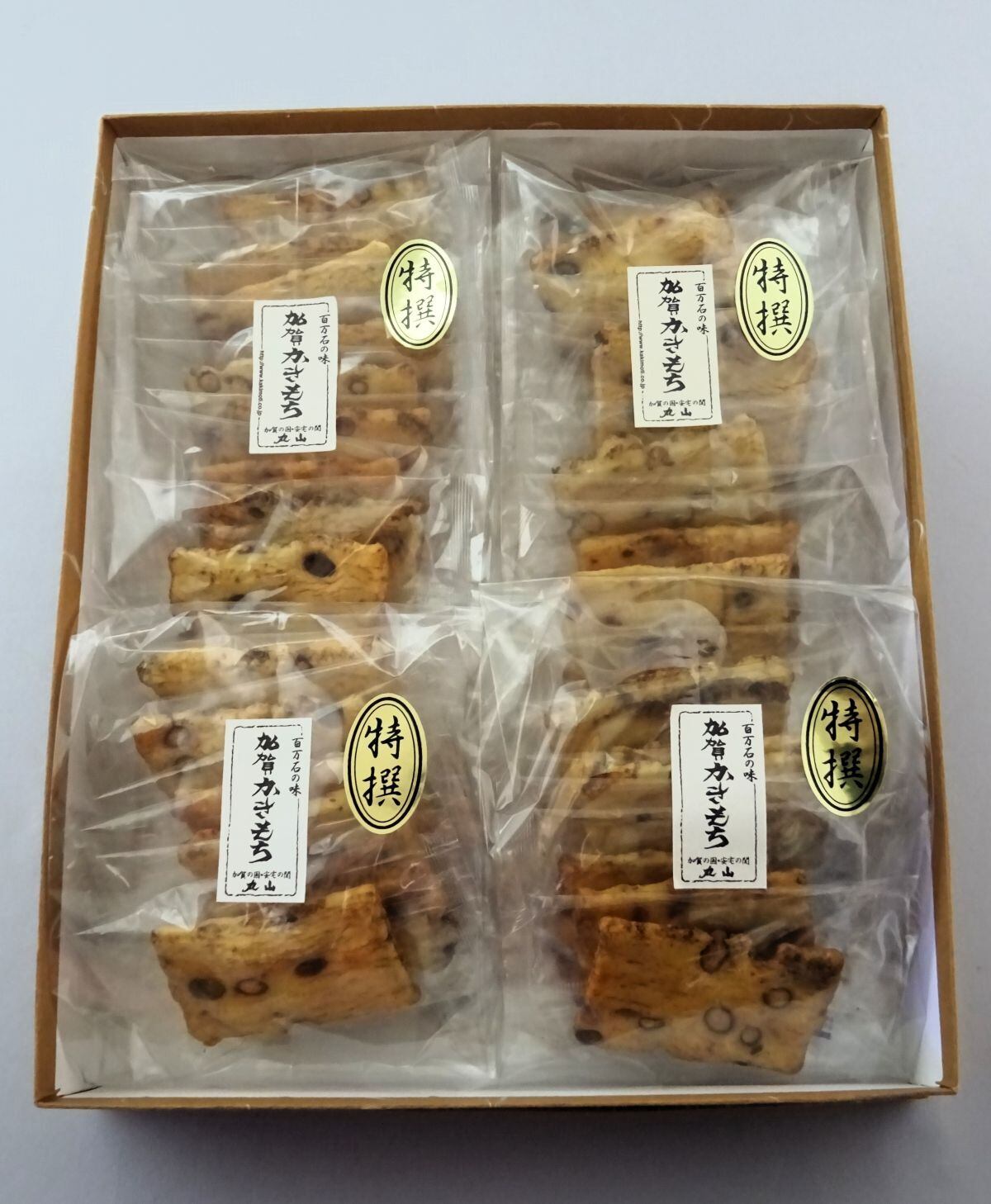 *こだわり;2か月仕立て無添加・・・*米(石川県産100%)。 *水(霊峰白山の伏流水をイオン水で洗米から蒸し上げなど全てに使用) 醤油:金沢丸大豆醤油味(きび糖仕立て)。 *1,伝統に手返し水不使用で二度搗き仕上げ*キメ細かく、密度濃く、滑らかでよく伸びる上質糯にしあげる。 2,お餅を低温熟成乾燥して、お餅の旨みを凝縮する*寒仕込み製法。 3,石窯で素焼きに、ゆっくりと焼き上げる。 4,環境:375日24Hマイナスイオンシャワーが降り注ぐ工場で原材料が活性化し、これをマイナスイオン水で処理することで更に活き活き、水も空気も原材料も人も活性化して、生き生きとしいます。