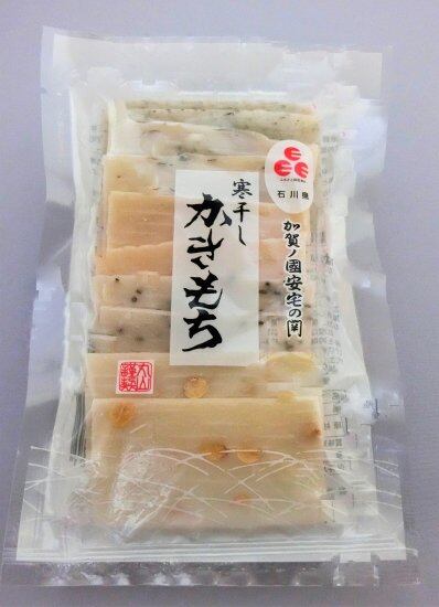 全国菓子大博覧会・無鑑査賞。不使用:アルコール・砂糖・旨み調味料・着色料・保存料 石川県認定Eマーク商品。石川県産の糯米「神楽糯米」を100%使用した杵つき餅を、寒仕込み製法でゆっくりと干し挙げた・無添加品。加賀伝統の保存食です。昔は、厳冬に保存食として、おつまみ・おやつとして食べました。近年は、油であげたり・電子レンジでチンして食べます。焼きたてが食べられる手作りおかきとして人気です。 自然にやさしく、身体にもやさしい、「ハラもちがして消化がよい」と言われた元気になるおかきです。日本・石川のスローフードです。