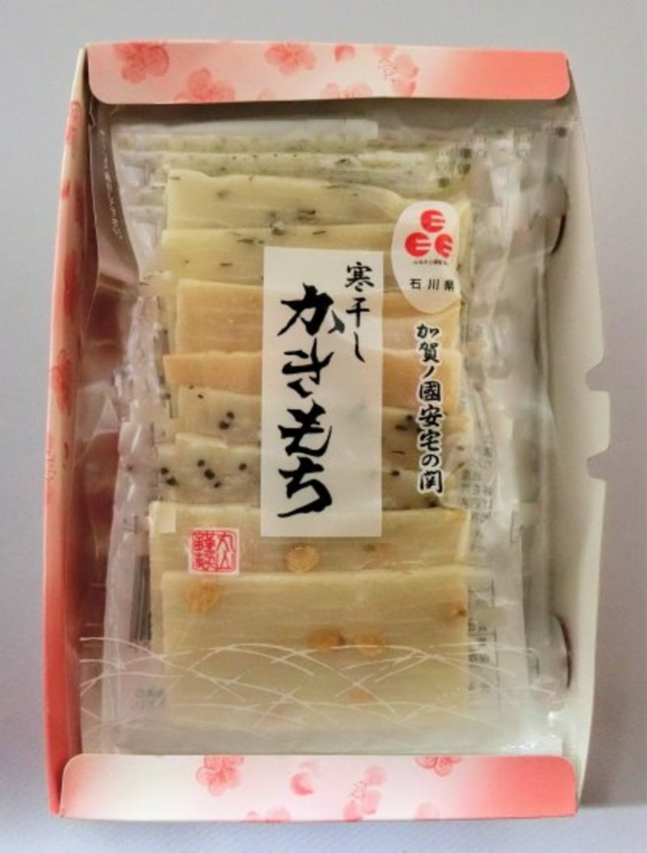 全国菓子大博覧会・無鑑査賞。不使用:アルコール・砂糖・旨み調味料・着色料・保存料 石川県認定Eマーク商品。石川県産の糯米「神楽糯米」を100%使用した杵つき餅を、寒仕込み製法でゆっくりと干し挙げた・無添加品。加賀伝統の保存食です。昔は、厳冬に保存食として、おつまみ・おやつとして食べました。近年は、油であげたり・電子レンジでチンして食べます。焼きたてが食べられる手作りおかきとして人気です。 自然にやさしく、身体にもやさしい、「ハラもちがして消化がよい」と言われた元気になるおかきです。日本・石川のスローフードです。