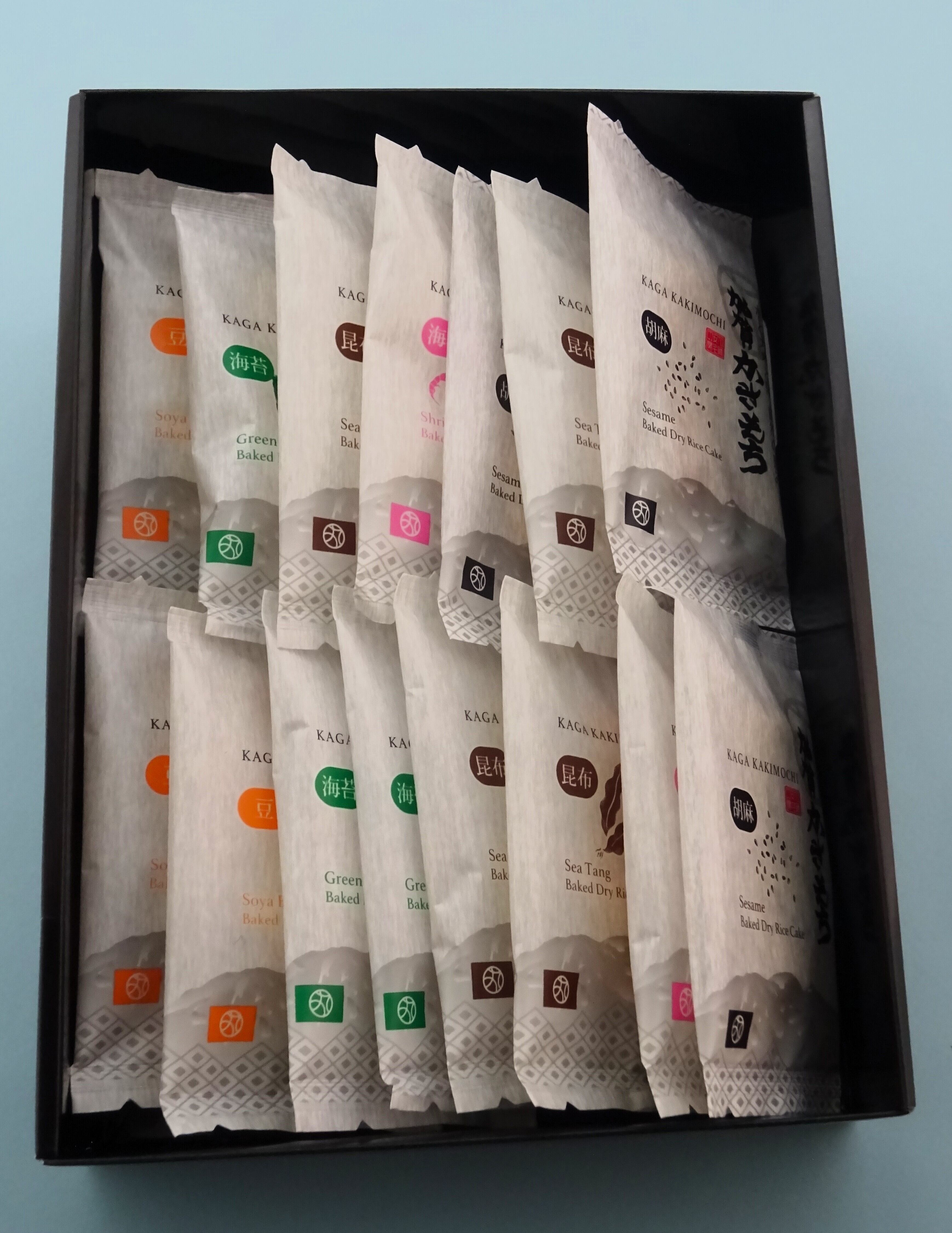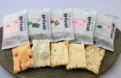 素焼き5種:豆・青のり・昆布・えび・胡麻の山海材料風味。 不使用:アルコール・砂糖・醤油・旨み調味料・着色料・保存料。 *全国菓子大博覧会「大臣栄誉賞」受賞。 *歌舞伎十八番・勧進帳の舞台「安宅関」にて、難関を抜けた義経・弁慶一行に喜捨されたといわれる寒干しかきもちを素焼きにした「加賀かきもち」。お餅の味がいきている無添加・ノンオイルで薄い塩味だけの素焼き仕立て。伝統の寒仕込み製法を礎とした二度搗き仕上げの餅を、ゆっくり低温熟成乾燥して餅の旨味を凝縮させて、ゆっくりとやきあげる事で、引き締まった深い味わい・男性的な歯触りとなっております。